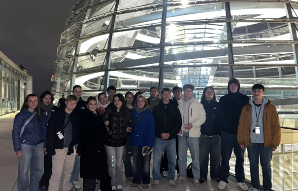 Der Donnerstag startete mit einem Treffen mit Ben Schneider, einem Mitarbeiter der Wahlkampfagentur Team Stauss, der uns die Mittel des politischen Wahlkampfs näherbrachte, bevor wir das Museum Hamburger Bahnhof besuchten. Dort hörten wir einen aufschlussreichen Vortrag über den Künstler Joseph Beuys, dessen Werke und Ideen uns zum Nachdenken anregten. Anschließend konnten wir die Ausstellungen eigenständig erkunden. Am Nachmittag ging es zum Bundestag, wo uns nach einer Sicherheitskontrolle die Kantine offenstand – eine besondere Gelegenheit, zusammen dort zu essen. Danach erhielten wir die Möglichkeit, eine Debatte im Plenarsaal live mitzuerleben, was sich besonders aufgrund der US-Wahlergebnisse und dem Zersplittern der Ampel-Koalition am Vortag als interessant herausstellte. Im Anschluss bekamen wir von dem Bundestagsabgeordneten Herrn Hoffmann spannende Einblicke in seinen politischen Alltag und konnten unsere Fragen stellen. Zum Abschluss genossen wir von der Kuppel des Bundestags einen beeindruckenden Ausblick über Berlin. Den Abend verbrachten wir damit, die verschiedenen Denkmäler, die an die Verbrechen des Holocaust erinnern, zu besuchen und uns mit der Erinnerungskultur zu beschäftigen.